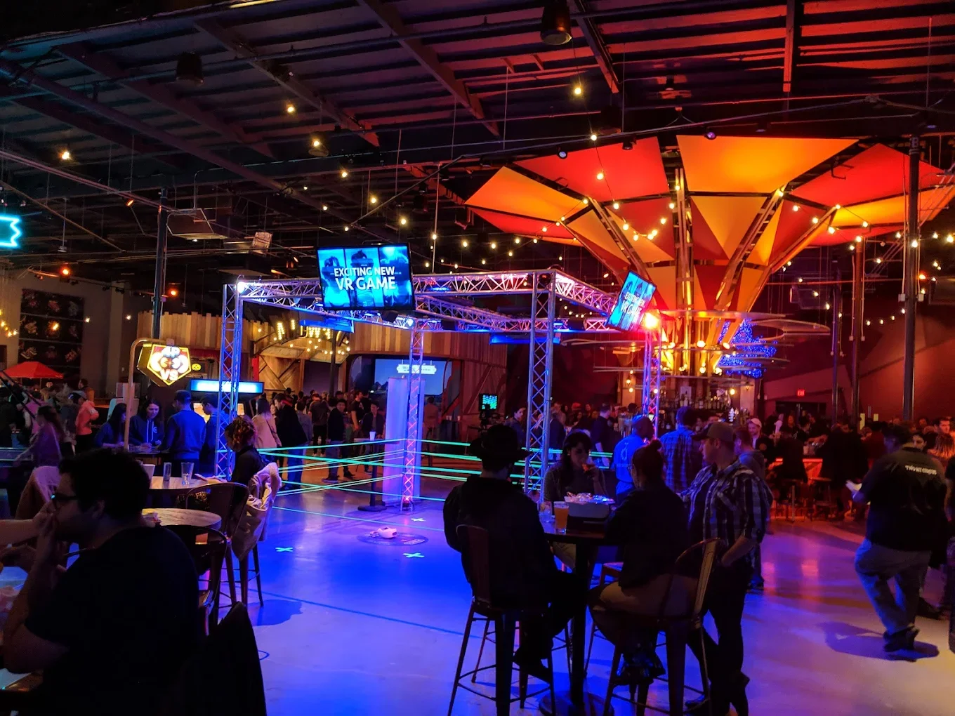 The space is colorful, loud, and intentionally overstimulating in a way that shakes people out of work mode fast. On-site food and bar service keeps energy high between rounds. Located downtown, accessible via Metro or rideshare.